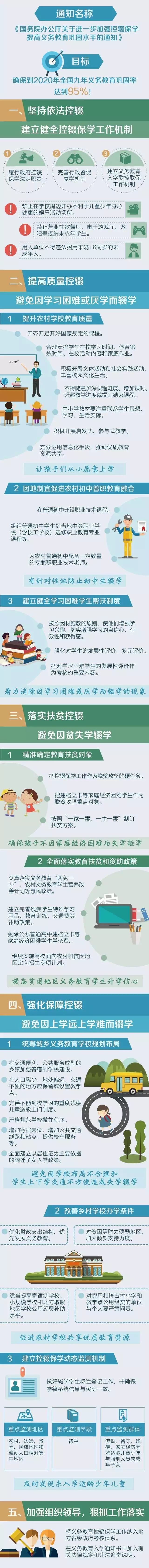 国务院办公厅发布《关于进一步加强控辍保学提高义务教育巩固水平的通知》,要求进一步防控义务教育学生失学辍学,确保实现到2020年全国九年义务教育巩固率达到95%的目标,切实保障适龄儿童少年依法接受义务教育,为早日实现“一个都不能少”的教育理想进一步夯实基础。