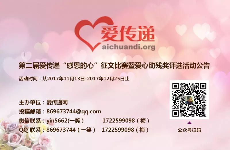 爱永远是我们的主旋律,传扬爱心,靠你,靠我,靠大家。正所谓:只要人人都献出一点爱,世界将变成为美好的人间。所以为传扬爱心、鼓励善行,颂扬社会爱心人士扶残助残高尚品德,表达残障人感恩之情,让社会更多了解残障人内心世界;同时,也为了鼓励残障人发挥文学创作才能,活跃精神文化生活。我们在2017年上半年成功举办首届爱传递征文比赛,引起了社会各界的关注,帮助与温暖了许多需要帮助的人。真是有不错的反响。为此,我们决定在2017年下半年举办第二届爱传递“感恩的心”征文比赛(以下简称“征文”)并同时举办爱心助残奖评选。