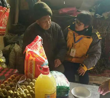 最后看望的这位爷爷是一位盲人,我们肩上扛着大米袋子,手上拎这已经冻结的粮油和冰凉的鸡蛋,慢慢走进爷爷的家里。