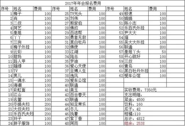 2017年会报名收款明细:收取费用:7350元,支出:4812元,结余:2538元,在征得群内兄弟姐妹们的同意后,把余款放入2018年的爱心活动中!