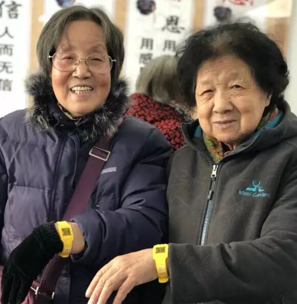 两位可爱的奶奶,领到黄手环之后拉着摄影老师给自己留了一张难忘的合影。